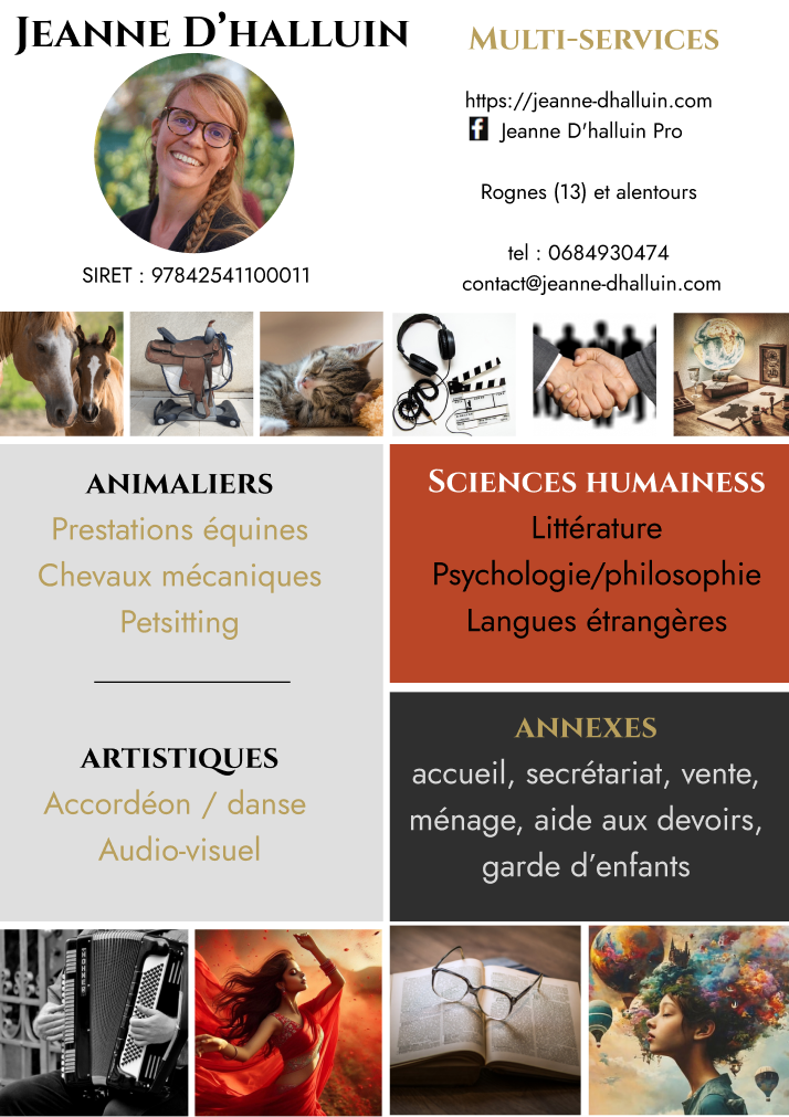 J’ai créé ma micro-entreprise afin de partager mes connaissances et savoirs-faire dans les domaines qui me passionnent : le milieu équin, les animaux, la musique, la danse, le monde littéraire, la psychologie, l'audiovisuel….